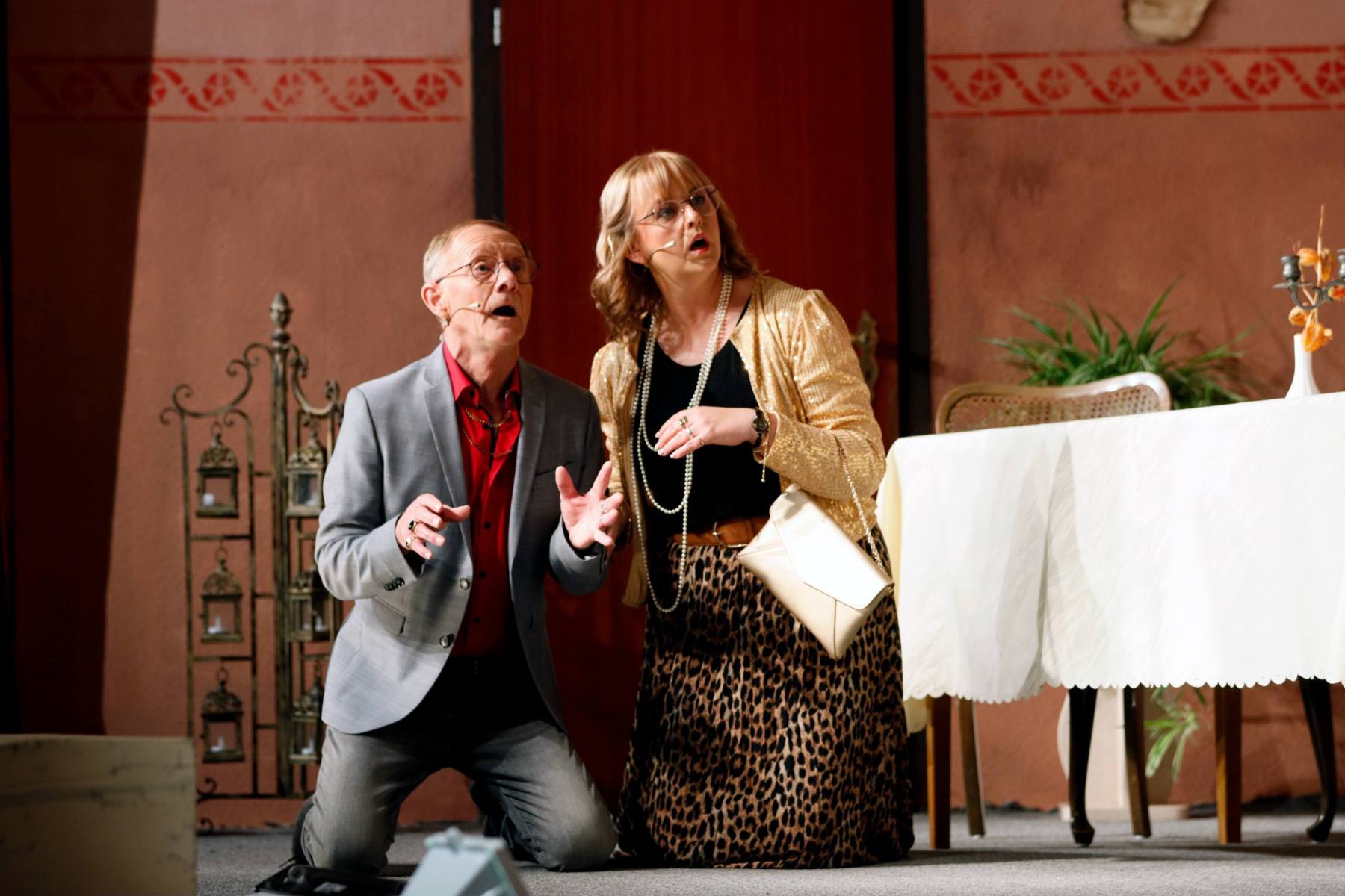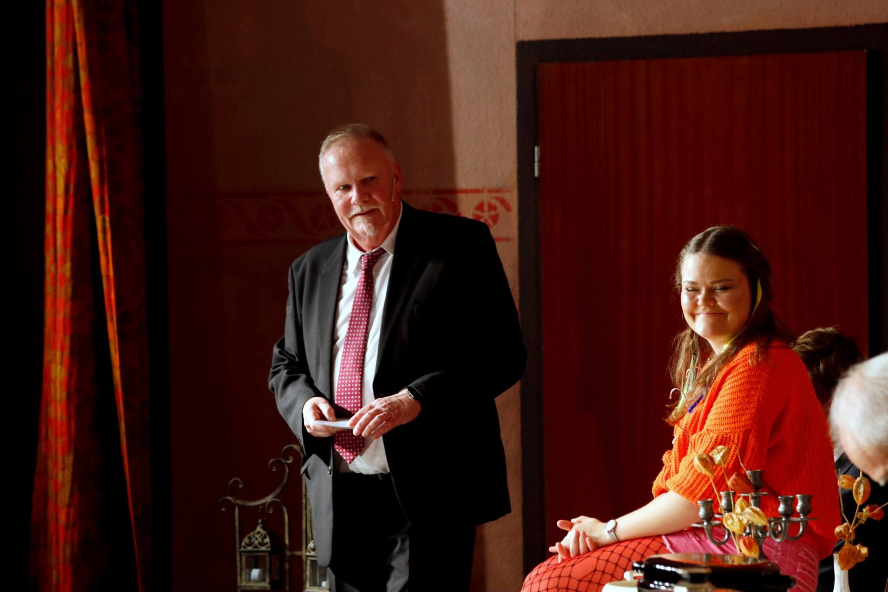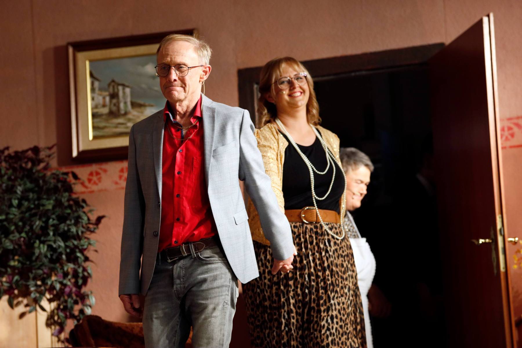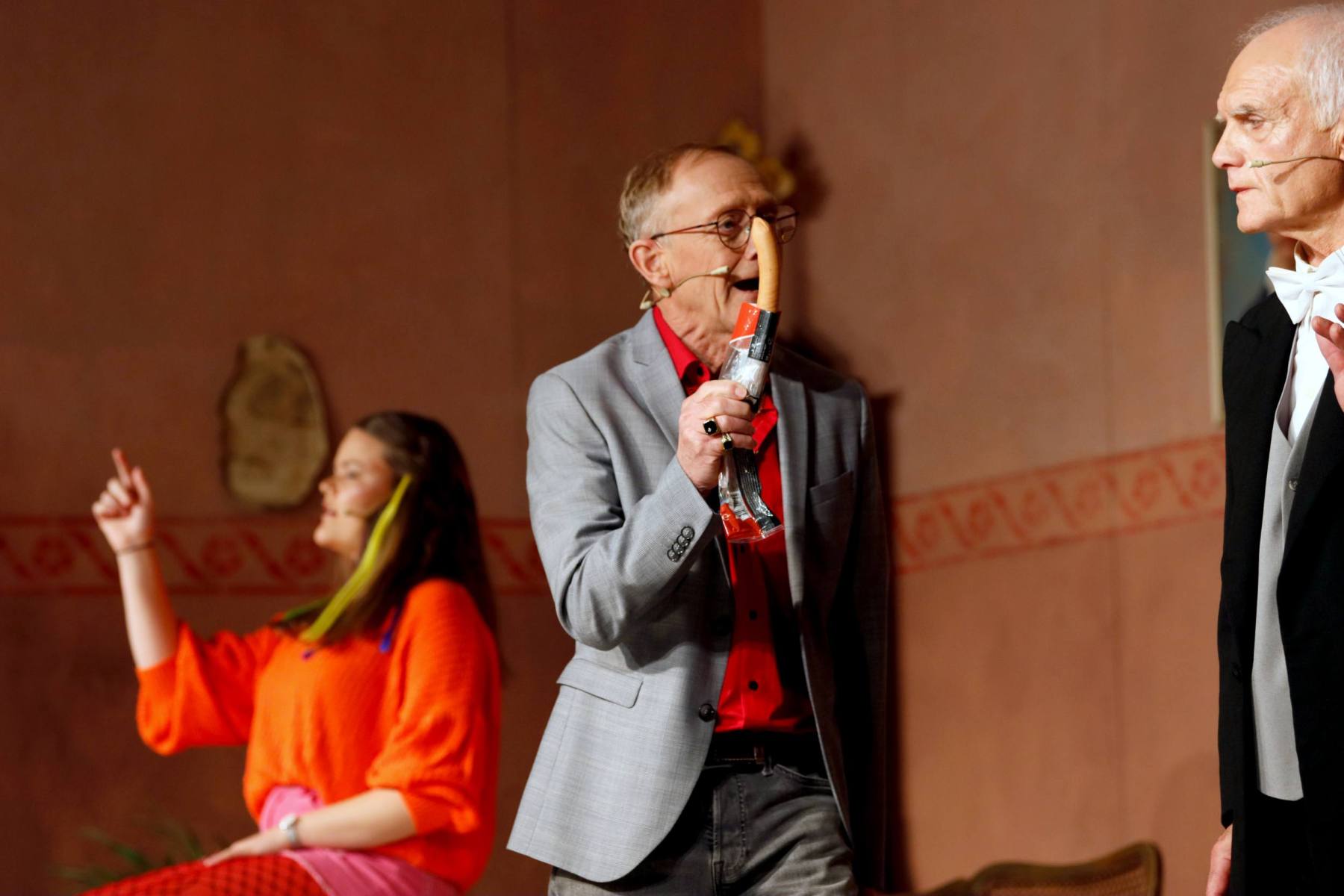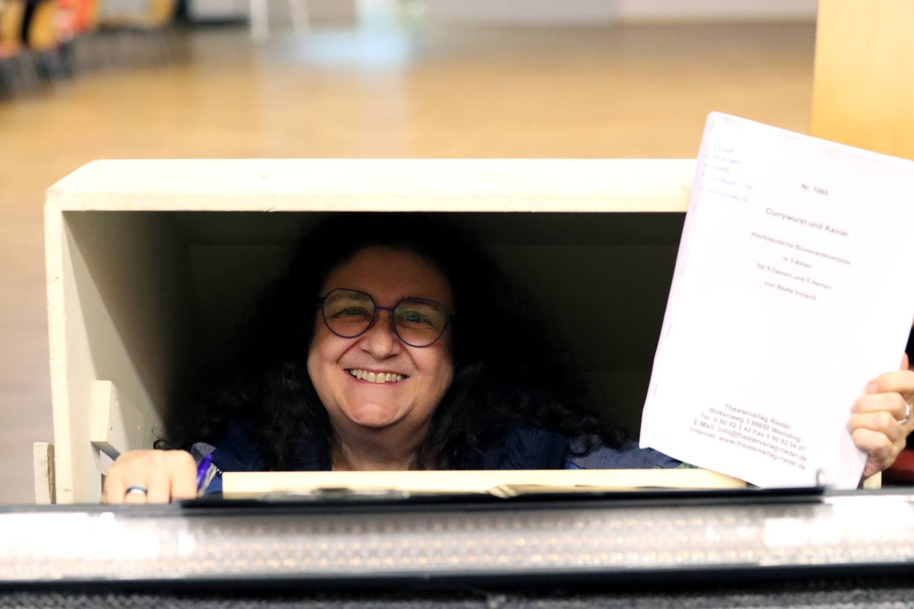 Der Vorhang öffnete zu den Klängen von Karel Gotts „Es wird schon weitergehen“. Dieses Lied passt auch sehr gut in die Vorbereitung des Stückes. Unser Spielleiter stand vor der schwierigen Aufgabe ein passendes Werk für die in diesem Jahr dezimierte Akteuren-Crew zu finden. Keine Leseprobe, die ihm gefiel, war anständig zu besetzen. Vor etwa drei Monaten dann der Wandel, Norri hat mit „Currywurst und Kaviar“ nicht nur eine tolle Komödie gefunden, sondern hatte auch eine passende Mannschaft parat. Mit Mira Schäfer, Anika Werkle, Britta Brill und Max Brill haben wir mit gleich vier Debütanten auf unserer großen Bühne einen wahren Volltreffer gelandet! Alle haben sich hervorragend ins Team integriert, und die Abende durch starkes Spiel bereichert. Dann ging es richtig Flott: