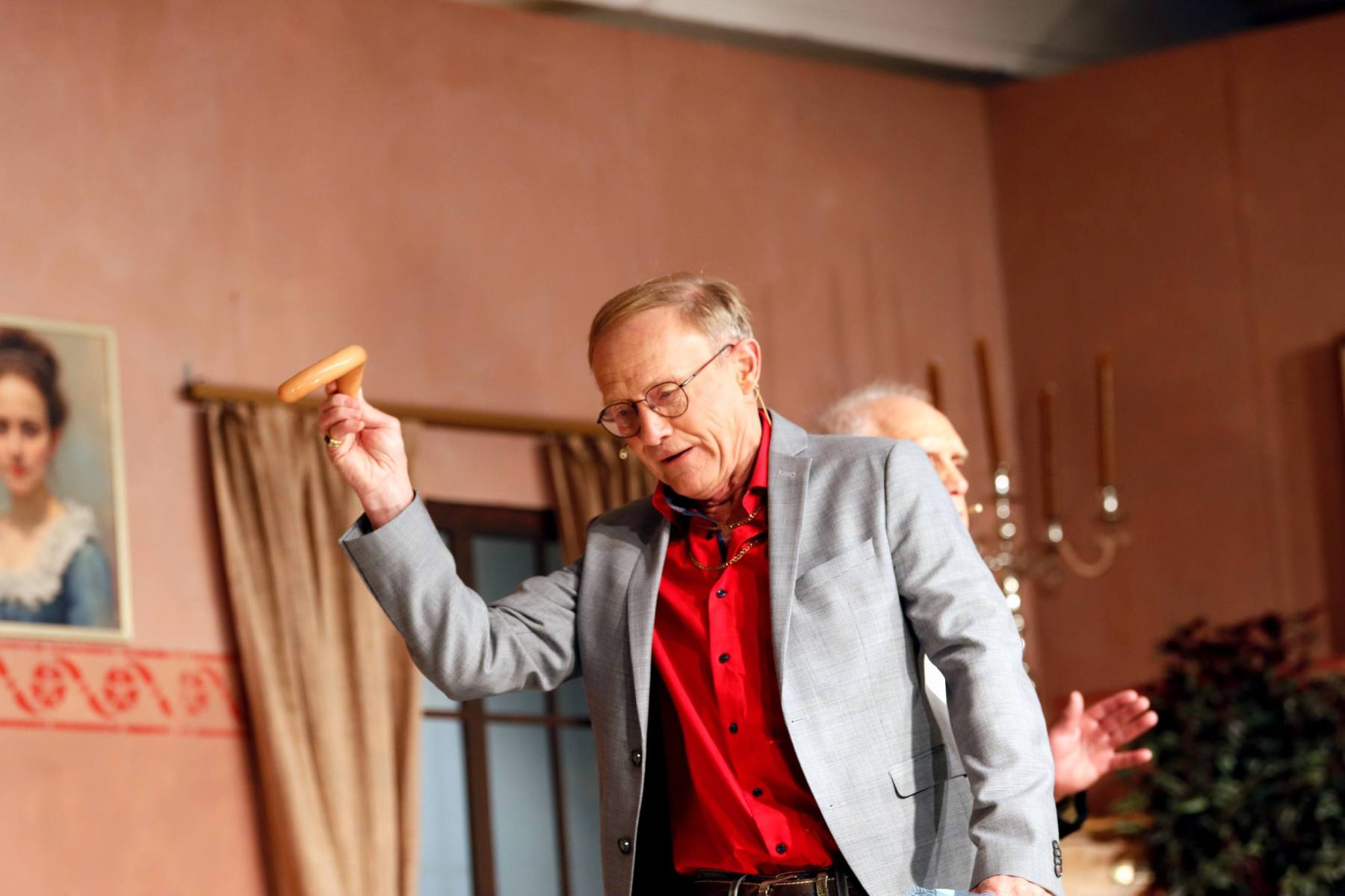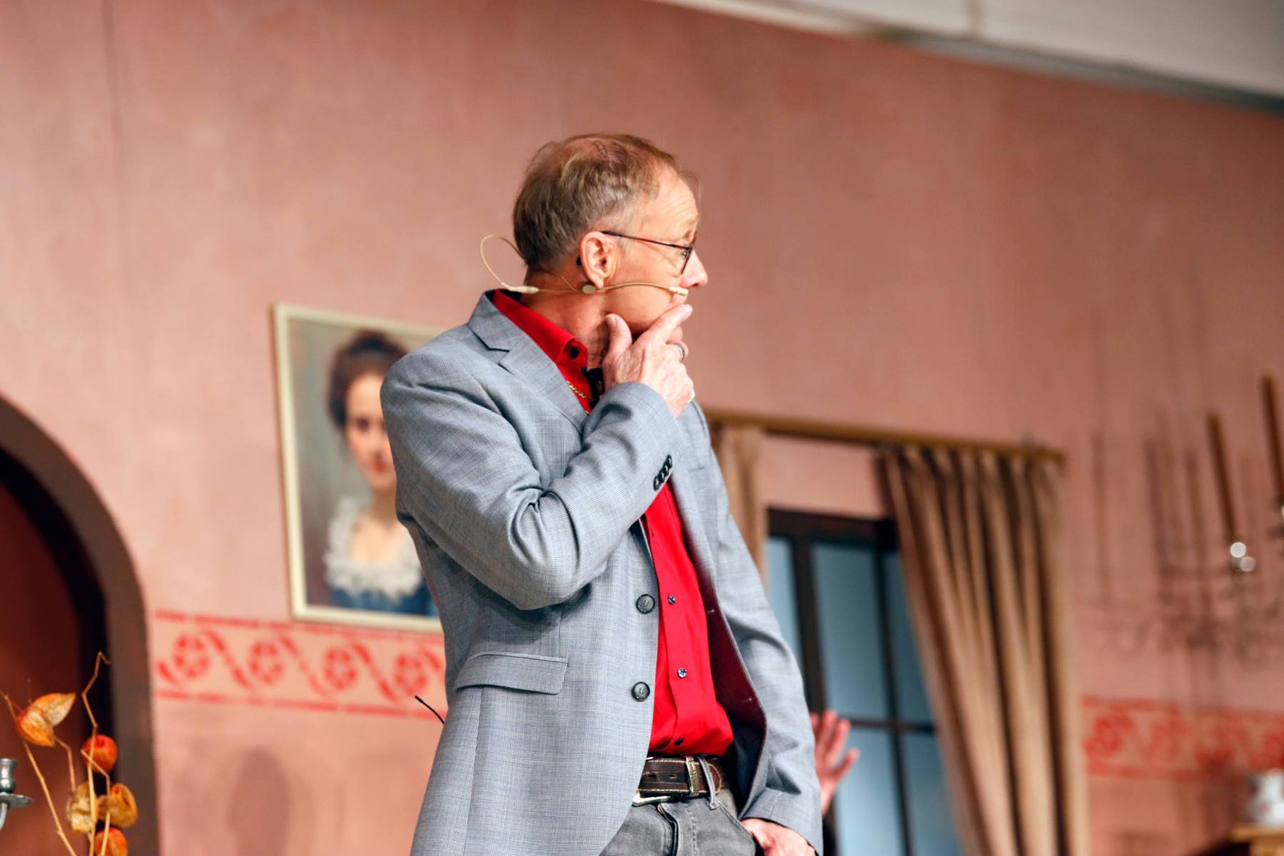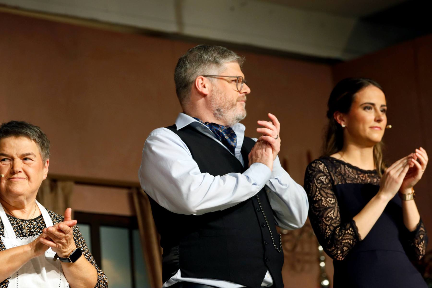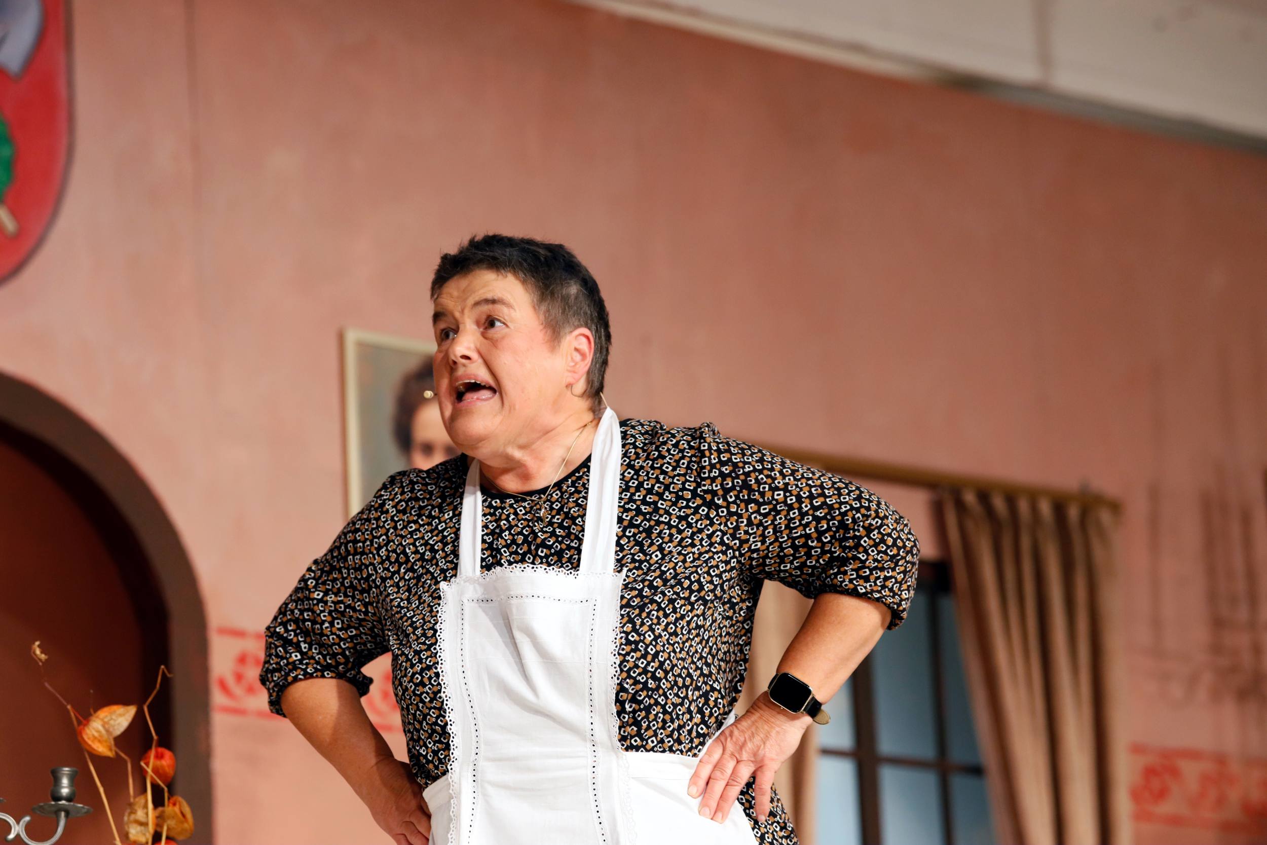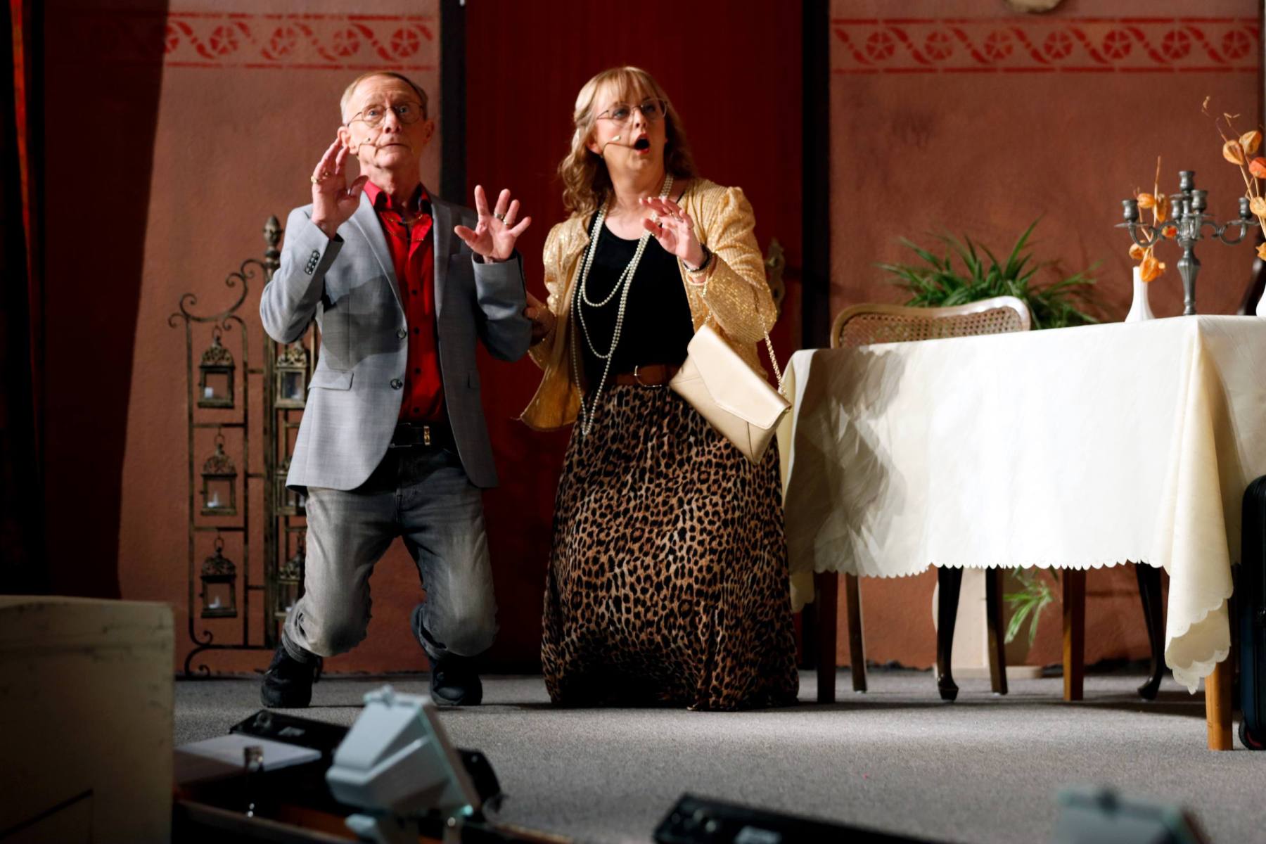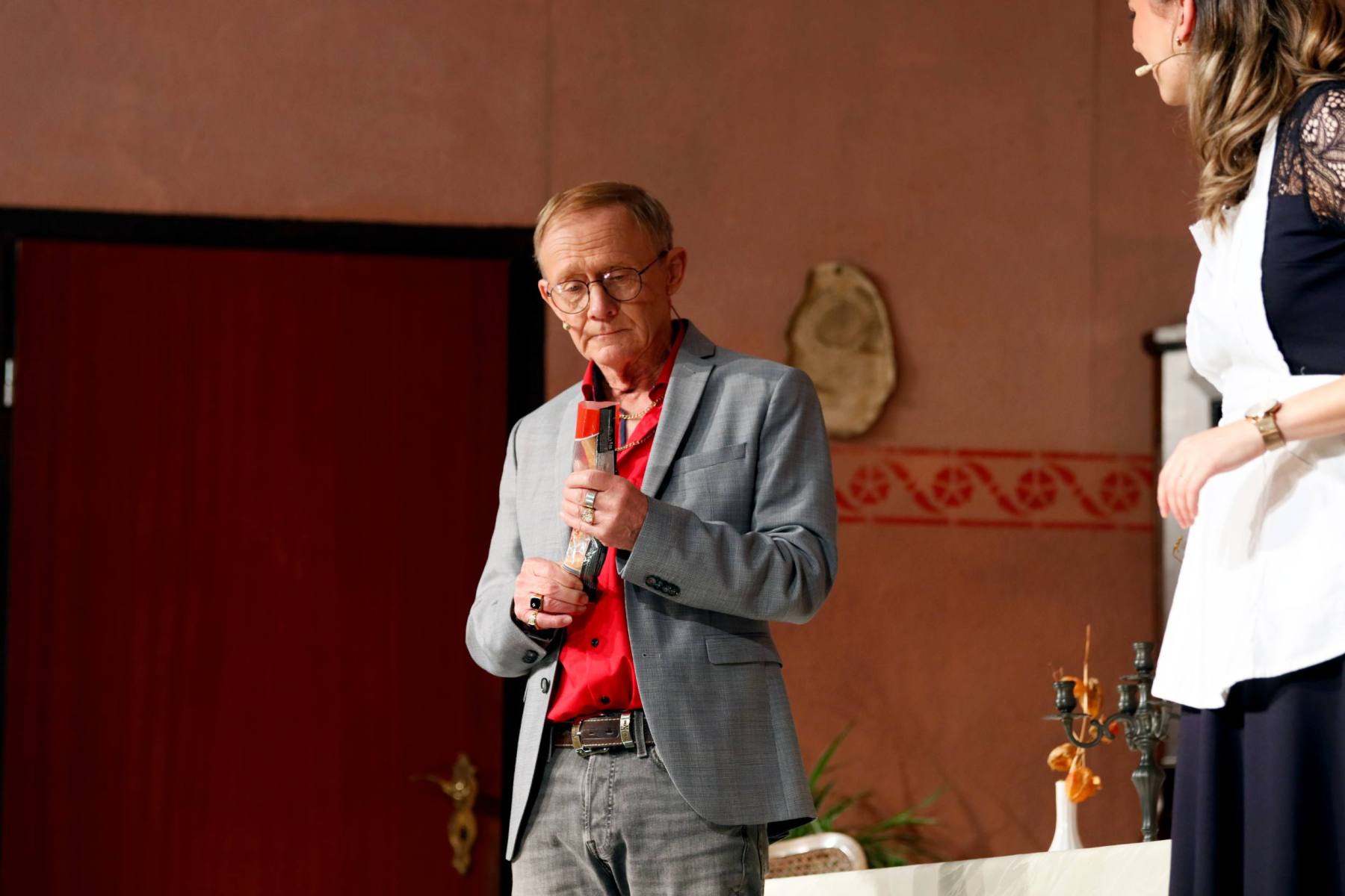 Der Vorhang öffnete zu den Klängen von Karel Gotts „Es wird schon weitergehen“. Dieses Lied passt auch sehr gut in die Vorbereitung des Stückes. Unser Spielleiter stand vor der schwierigen Aufgabe ein passendes Werk für die in diesem Jahr dezimierte Akteuren-Crew zu finden. Keine Leseprobe, die ihm gefiel, war anständig zu besetzen. Vor etwa drei Monaten dann der Wandel, Norri hat mit „Currywurst und Kaviar“ nicht nur eine tolle Komödie gefunden, sondern hatte auch eine passende Mannschaft parat. Mit Mira Schäfer, Anika Werkle, Britta Brill und Max Brill haben wir mit gleich vier Debütanten auf unserer großen Bühne einen wahren Volltreffer gelandet! Alle haben sich hervorragend ins Team integriert, und die Abende durch starkes Spiel bereichert. Dann ging es richtig Flott: