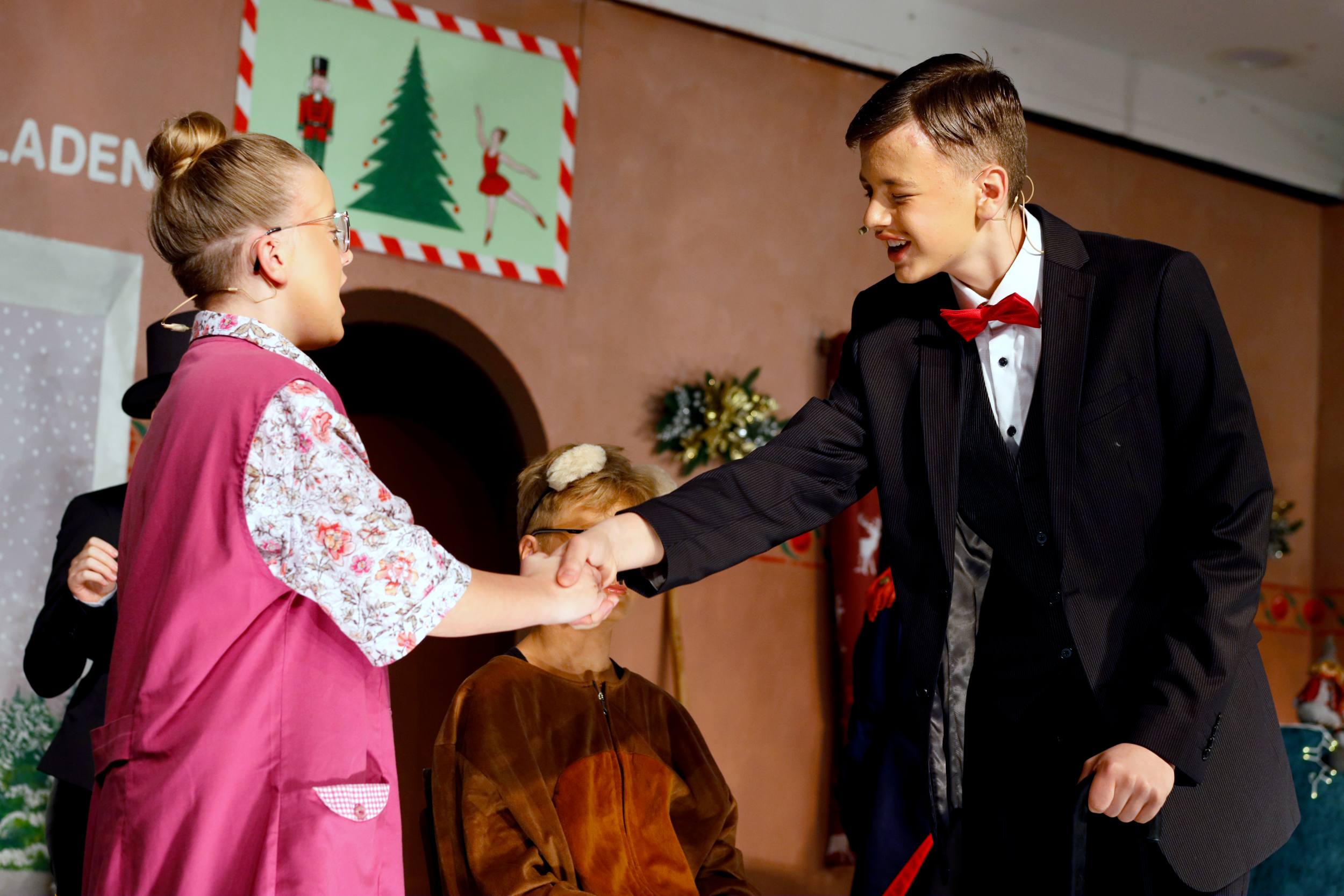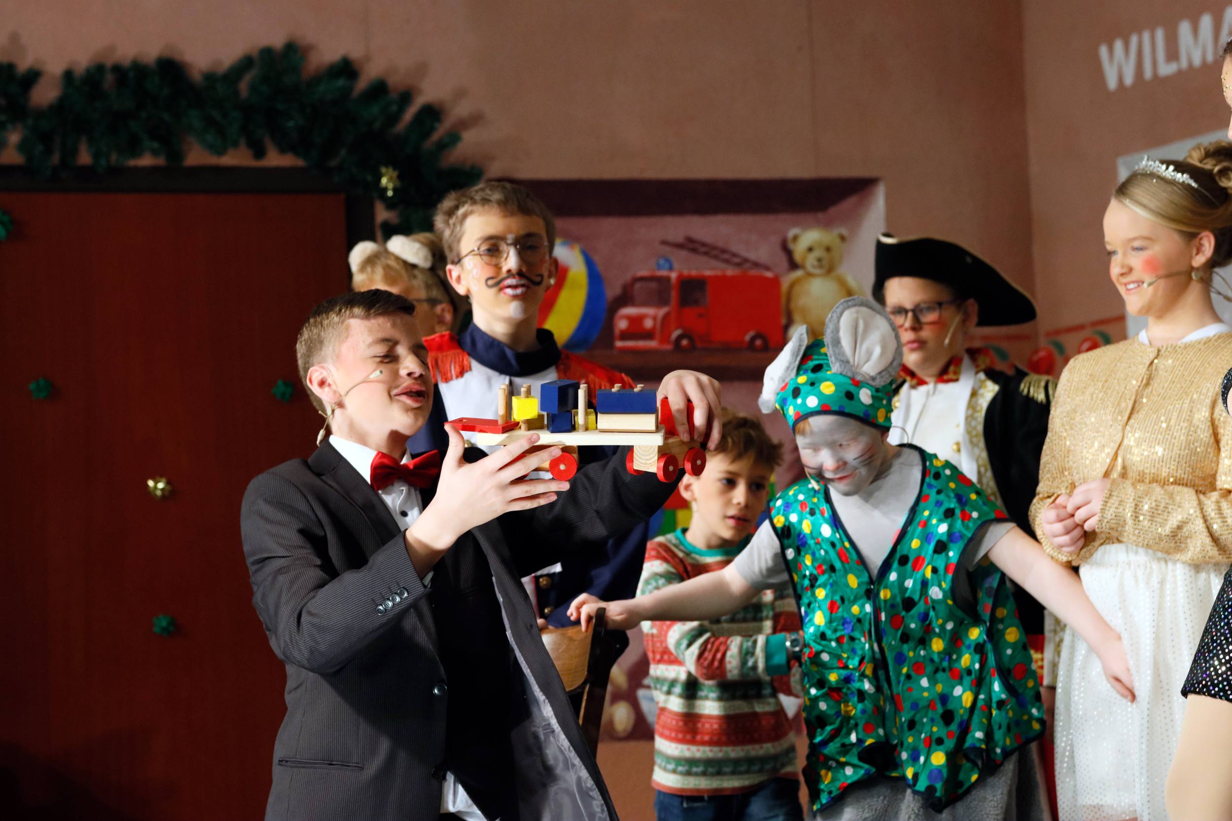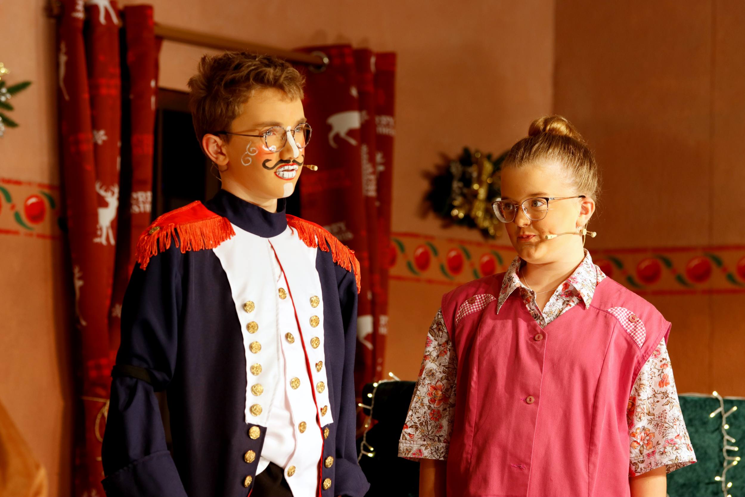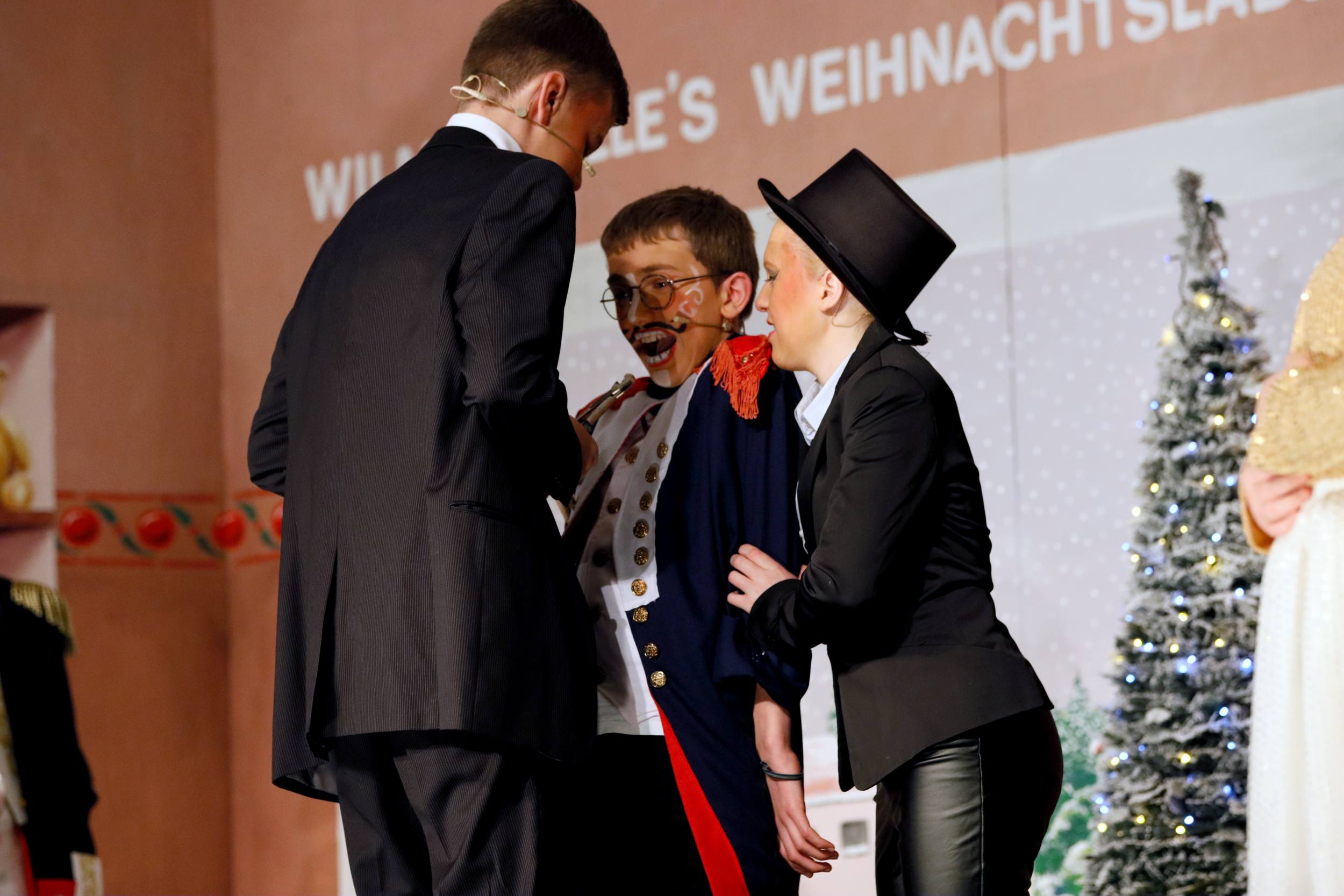 In zwei Akten mit einer Pause konnten die Zuschauer erleben, wie mit Hilfe einer kleinen Maus und eines tanzliebenden Weihnachtsengels (mit äußerst schlagkräftigen Argumenten) das Fest doch noch gerettet werden konnte. Ludwig Grässlich wird bekehrt und wendet sich dem Guten zu: Die Schulden werden erlassen, die arbeitslose Mutter erhält eine Stelle als Hausmeisterin und bringt Haus und Spielzeuge wieder auf Vordermann. Und selbst der böse Schleimteufel wird am Ende mit einer riesigen Schüssel frischen Schleims als Weihnachtsgeschenk – und einem kleinen Lächeln im Gesicht – von der Bühne vertrieben. Gekrönt war das Stück mit schönem Gesang von Marie-Claire und Thomas Bauerfeld.